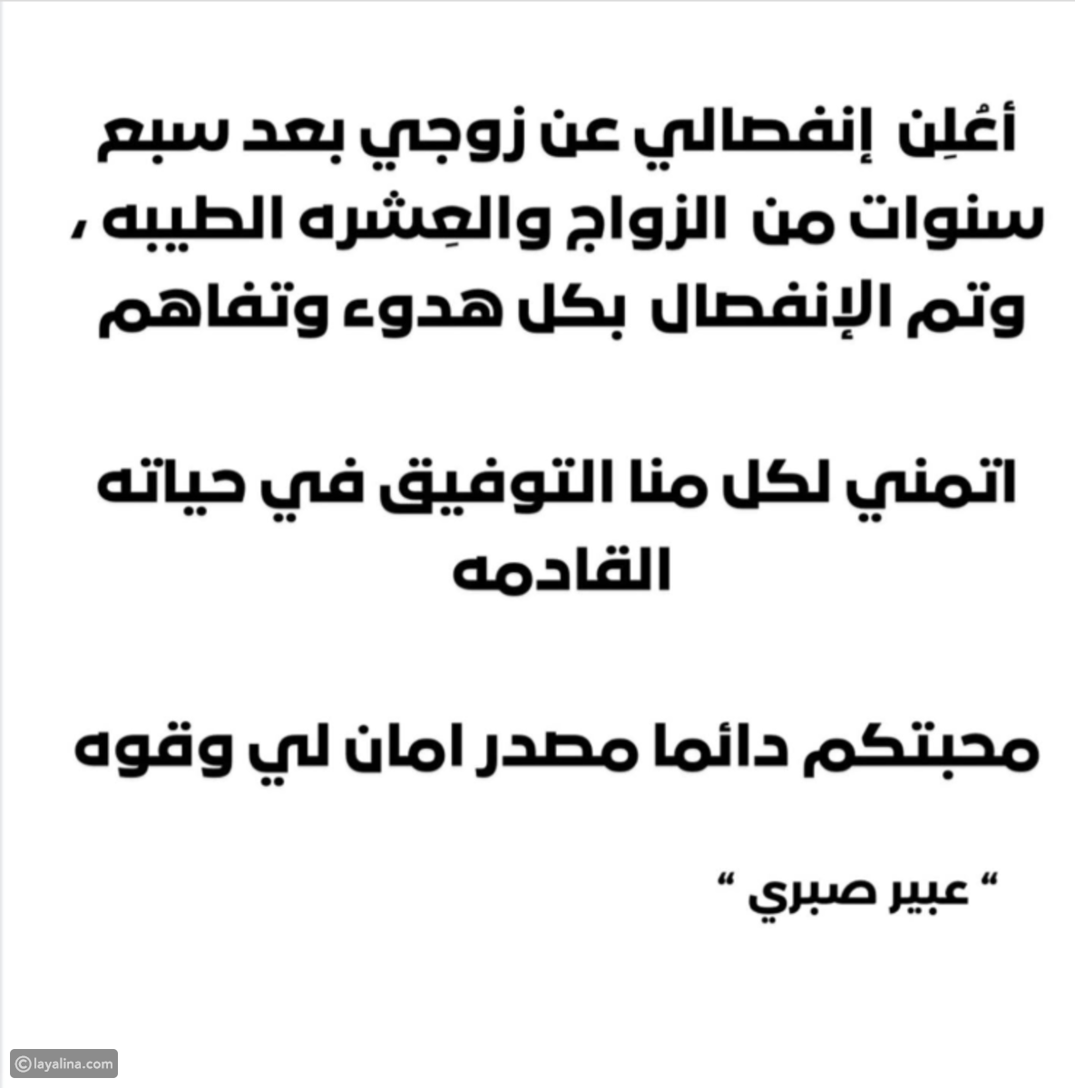 Abir Sabri memposting unggahan di akun pribadinya di platform Instagram dan menulis: "Saya umumkan perpisahan saya dari suami setelah tujuh tahun pernikahan dan kesenangan bersama. Proses perpisahan berjalan dengan tenang dan pengertian. Saya doakan setiap orang mendapatkan keberuntungan dalam hidupnya yang akan datang. Cinta dan dukungan Anda selalu menjadi sumber ketenangan dan kekuatan bagi saya".