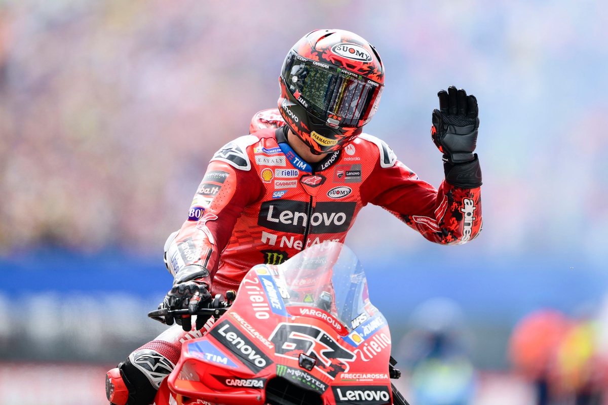 Pembalap Ducati Gresini sedang berjuang Pedro Acosta ’KTM untuk posisi keempat awal dalam balapan, dengan keduanya bersentuhan saat melewati tikungan Strubben pada lap keenam.