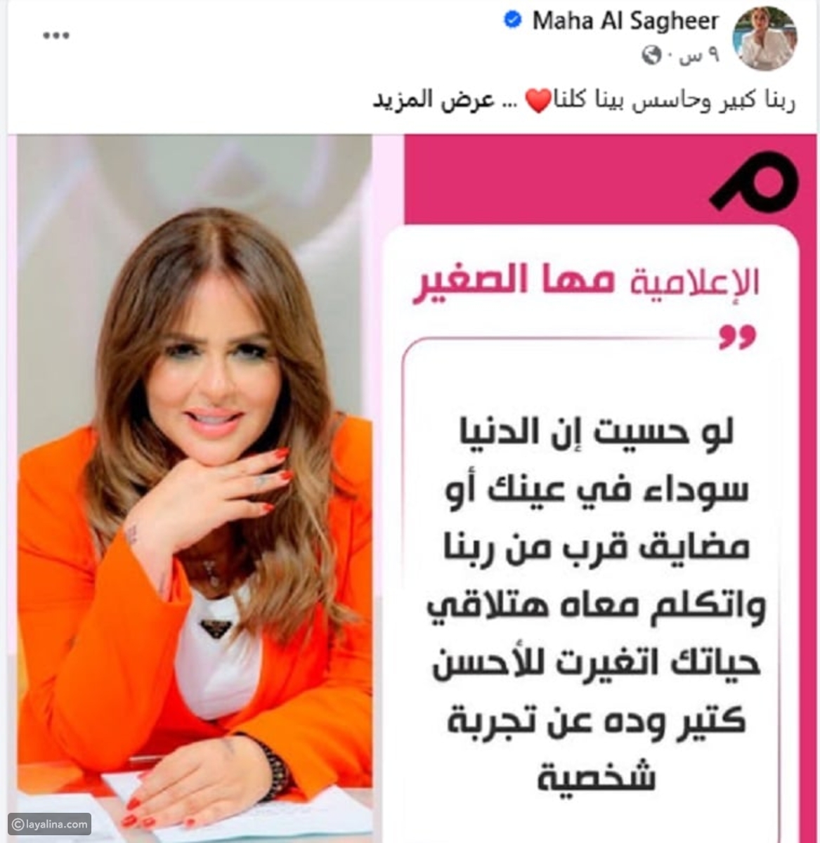 Presenter televisi Mesir Maha Al-Saghier menyampaikan pesan yang menyentuh kepada penontonnya melalui unggahan di halaman Facebook resminya, bertepatan dengan berlanjutnya masalah hukumnya dengan mantan suaminya, seorang seniman.Ahmed El Sakka.