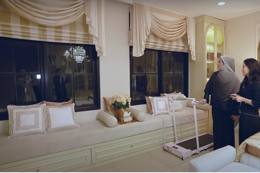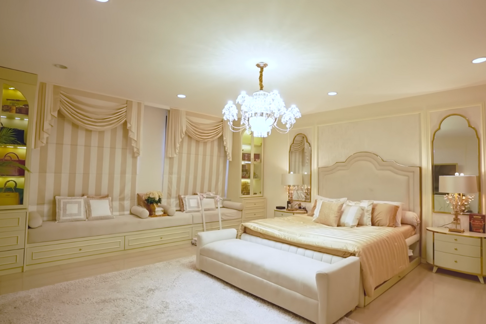 Kamar ini dilengkapi dengan lemari khusus untuk menyimpan koleksi tas miliknya. Tempat tidur berukuran besar, lampu-lampu indah, dan elemen interior mewah semakin memperkuat nuansa kemewahan kamar tersebut.