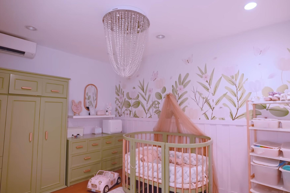Kamar anaknya didesain khusus oleh Tasyi Athasyia dengan perhatian penuh pada detail. Lemari pakaian berwarna hijau dan merah muda menambah kesan lembut dan harmonis yang sesuai untuk kamar anak.