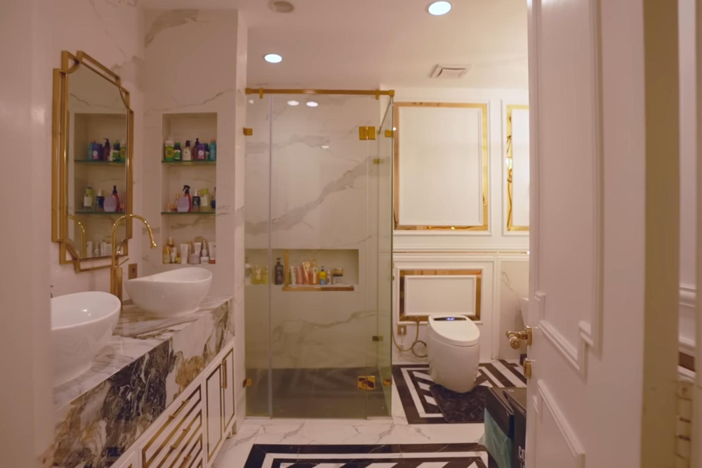 Selain kamar mandi di kamar tamu, ada kamar mandi lain yang terhubung dengan kamarnya. Kamar mandi ini menggunakan tema warna putih, hitam, dan gold terinspirasi dari hotel Langham Jakarta.