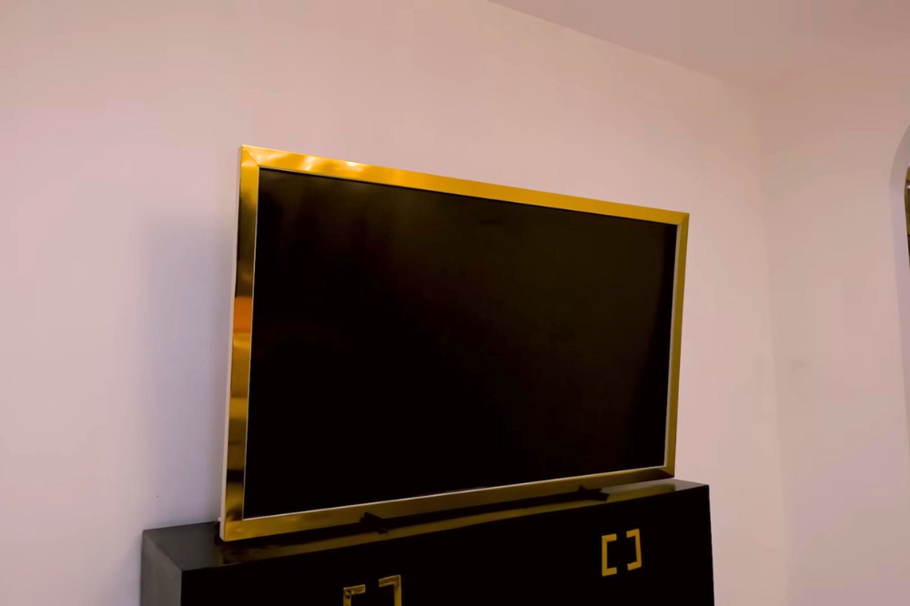 Televisi besar berwarna hitam di kamar tamu dibingkai dengan warna gold yang menambah kesan mewah ruangan. Kombinasi warna hitam dan gold ini memperkuat identitas desain interior rumah yang elegan dan modern.