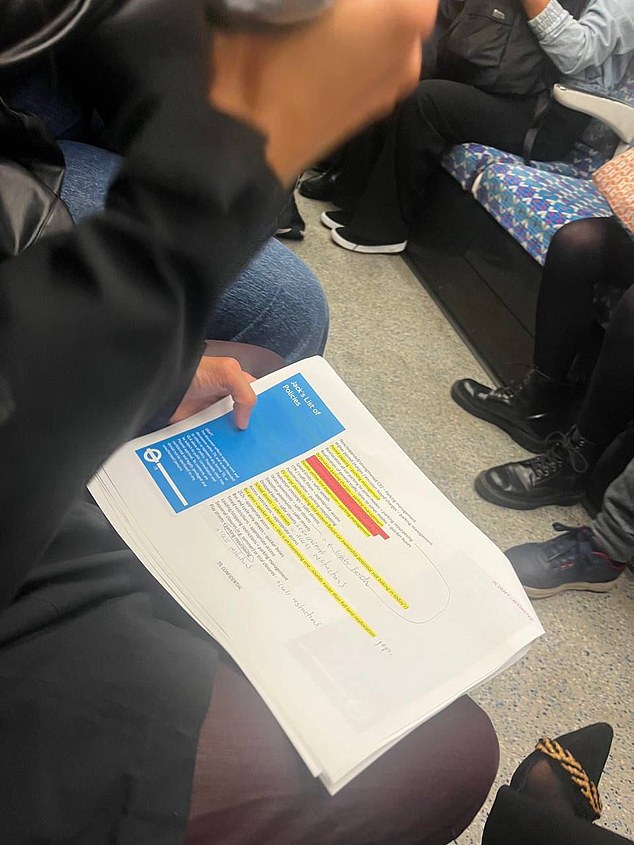 Pejabat pemerintah setempat, yang identitasnya tidak diketahui, terlihat membaca dokumen tersebut—yang bertanda 'rahasia'—di London Underground pada 3 Juni.