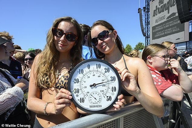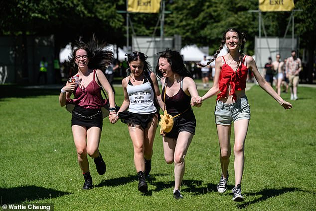 Pada hari kedua festival musik TRNSMT di Glasgow Green, petugas keamanan menyemprotkan selang air ke kerumunan untuk membantu para pengunjung tetap sejuk.