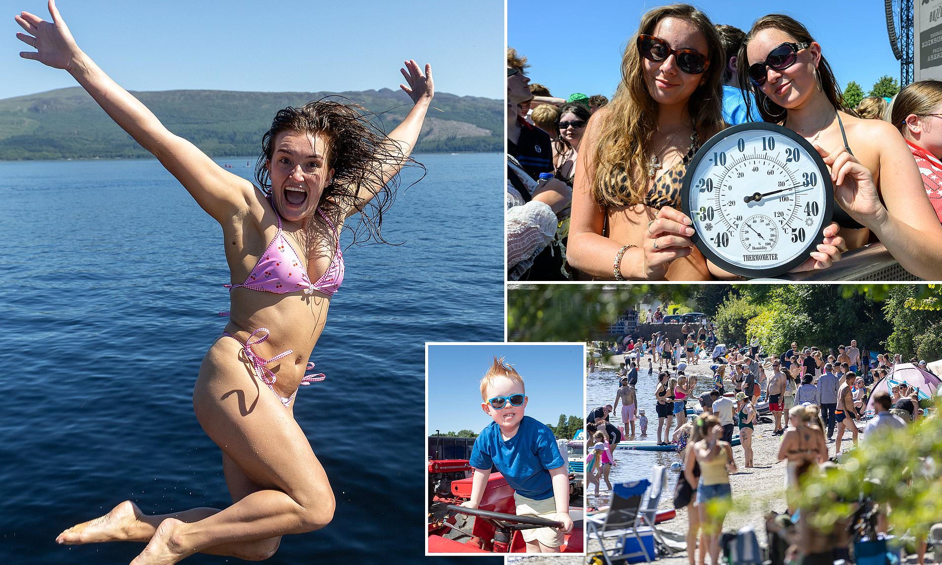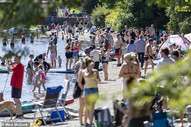 Keluarga yang menuju daerah-daerah panas dengan jalan raya ke pantai populer dan Loch Lomond macet karena ratusan orang berlari untuk berjemur dan menikmati air.