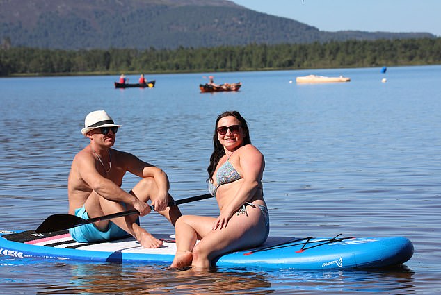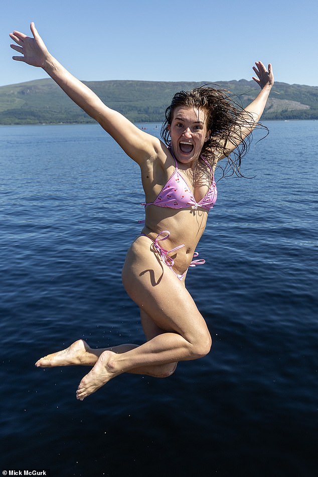 Mitch Jachacy dari Aviemore sedang bersenang-senang melompat dari papan nya ke danau untuk mencoba tetap sejuk.