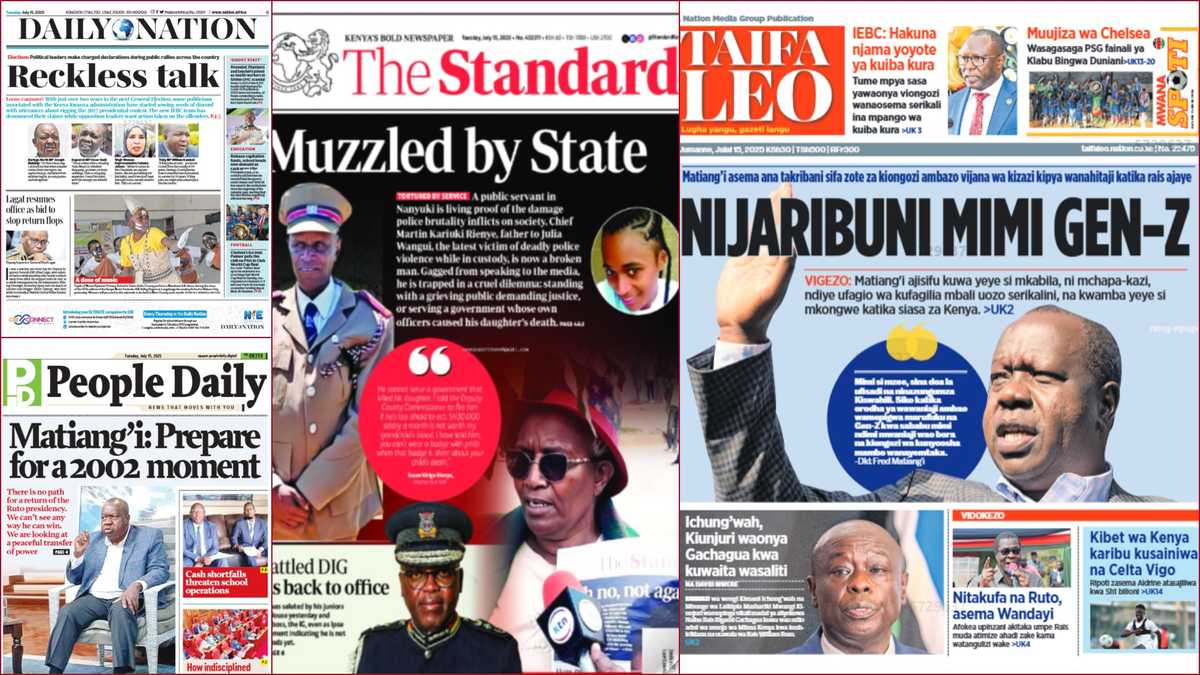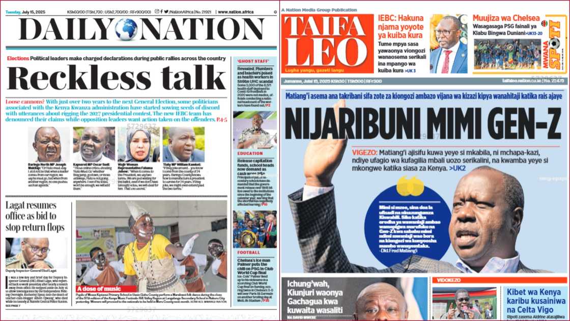 Surat kabar Kenya pada Selasa, 15 Juli, secara utama meliput keadaan politik yang tetap, dengan oposisi menempatkan diri dalam posisi unggul untuk menghadapi Presiden William Ruto dalam pemilihan tahun 2027.