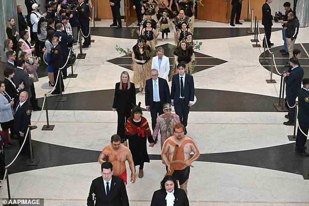 Prosesi resmi memasuki Great Hall Gedung Parlemen sebelum dilakukan penyambutan dengan "Welcome to Country" dan tarian tradisional.