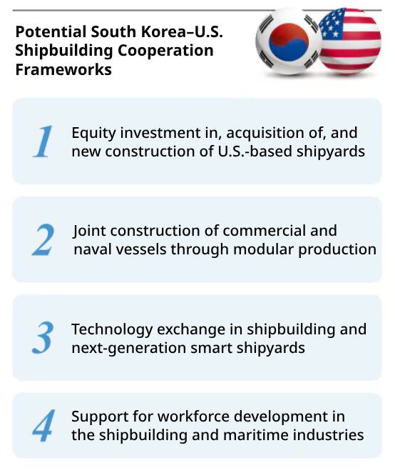 Sebagian dari dana investasi skala besar yang sedang dicari Washington—diperkirakan sebesar 400 miliar dolar—dapat digunakan untuk mendukung masuknya pemasok kapal kecil dan menengah asal Korea Selatan ke pasar Amerika Serikat serta membantu membangun ekosistem pembuatan kapal lokal. Pembelian tambahan atau pembangunan galangan kapal baru oleh perusahaan-perusahaan Korea Selatan juga sedang dipertimbangkan. Namun, seorang perwakilan dari satu pembuat kapal Korea mengatakan, "Galangan kapal di AS yang tersedia untuk dijual sangat langka, dan dengan kebijakan pemerintahan Trump yang bisa berubah, ada alasan untuk bersikap hati-hati."