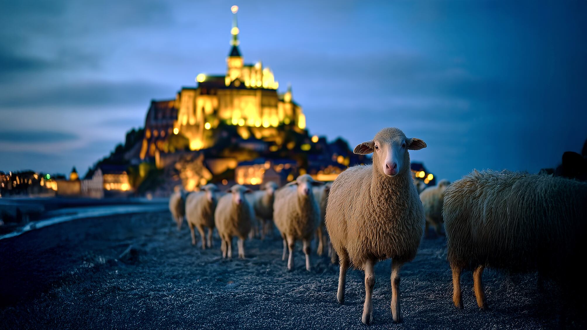 Kawanan domba di depan Mont-Saint-Michel di dinding pameran dibuat dengan memasukkan foto yang saya ambil 40 tahun lalu ke dalam AI. Saya memotret istana di tengah laut, dan pemandangan kawanan domba yang lewat—pemandangan yang pernah saya lihat di kartu pos dan sangat ingin saya tangkap kembali beberapa dekade kemudian. Ketika saya meminta AI untuk menghasilkannya, gambar yang diinginkan muncul dalam 40 menit.