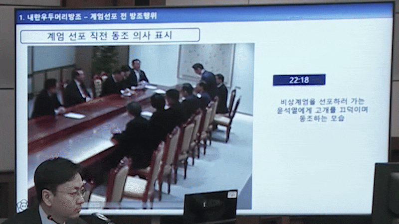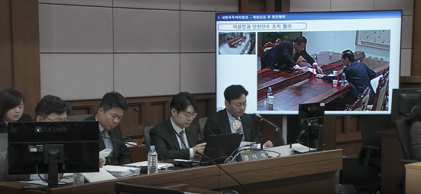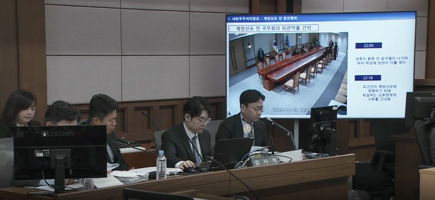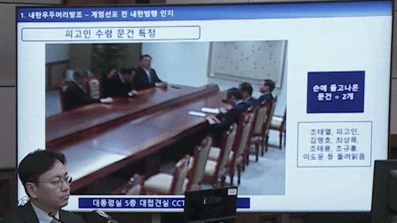 Footage CCTV yang dikumpulkan oleh tim penyelidik khusus difilmkan dari pukul 17.59 pada 3 Desember tahun lalu hingga pukul 10.00 pagi pada 4 Desember di ruang resepsi dan koridor, total 32 jam (16 jam masing-masing). Tim penyelidik khusus hanya mengedit bagian penting, sekitar 20 menit, untuk tinjauan bukti. Sebagian dari rekaman dari pukul 20.14 hingga 23.05 pada 3 Desember, tepat sebelum pengumuman keadaan darurat militer, ditampilkan secara publik di pengadilan.
